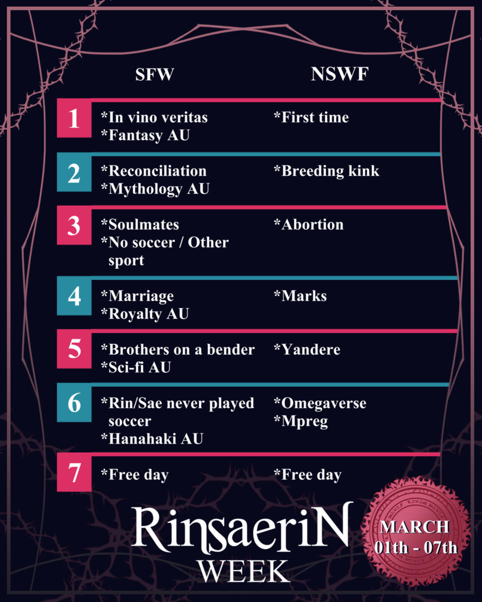 Q: Which ship is this week dedicated to?A: This week is dedicated to the pairing of Rin Itoshi and Sae Itoshi, regardless of your preferred pairing dynamic.Q: Who can participate?A: Anyone can participate. Since the event also includes NSFW submissions, anyone interested in creating such content must be of legal age.Q: How do the submissions work? Can I combine them?A: You can choose one submission per day or combine them as you prefer: across days, categories, etc.Q: Until when will submissions be accepted after the week ends?A: Until March 20th.Q: Are works in other languages allowed?A: Of course.Q: I’m an artist, how do I participate in the week?A: You can use whichever social network you prefer. We will promote works on X/Twitter, Tumblr, Bluesky, Tiktok, even AO3 allows images if you wish to post your work there.Q: My question has not been answered.A: You can ask through our Straw or send us a message on one of our other networks, we will gladly answer.